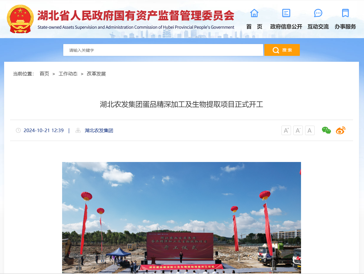 湖北省國資委:湖北農發集團蛋品精深加工及生物提取項目正式開工