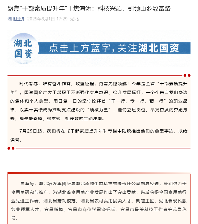 湖北省國資委:聚焦“干部素質(zhì)提升年”丨焦海濤:科技興菇,引領(lǐng)山鄉(xiāng)致富路